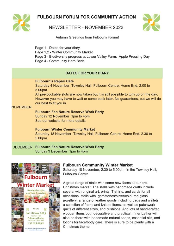 NOVEMBER NEWSLETTER Posted byjackieduckworthart02/11/202302/11/2023Posted inCommunity Click on the picture below to download your own copy of the Newsletter, including details of the stalls at the next community market; news about the Lower Farm project; pictures of the Apple Pressing day; and a discussion of the community herb beds. Share this: Click to share on X (Opens in new window) X Click to share on Facebook (Opens in new window) Facebook Like Loading... Related