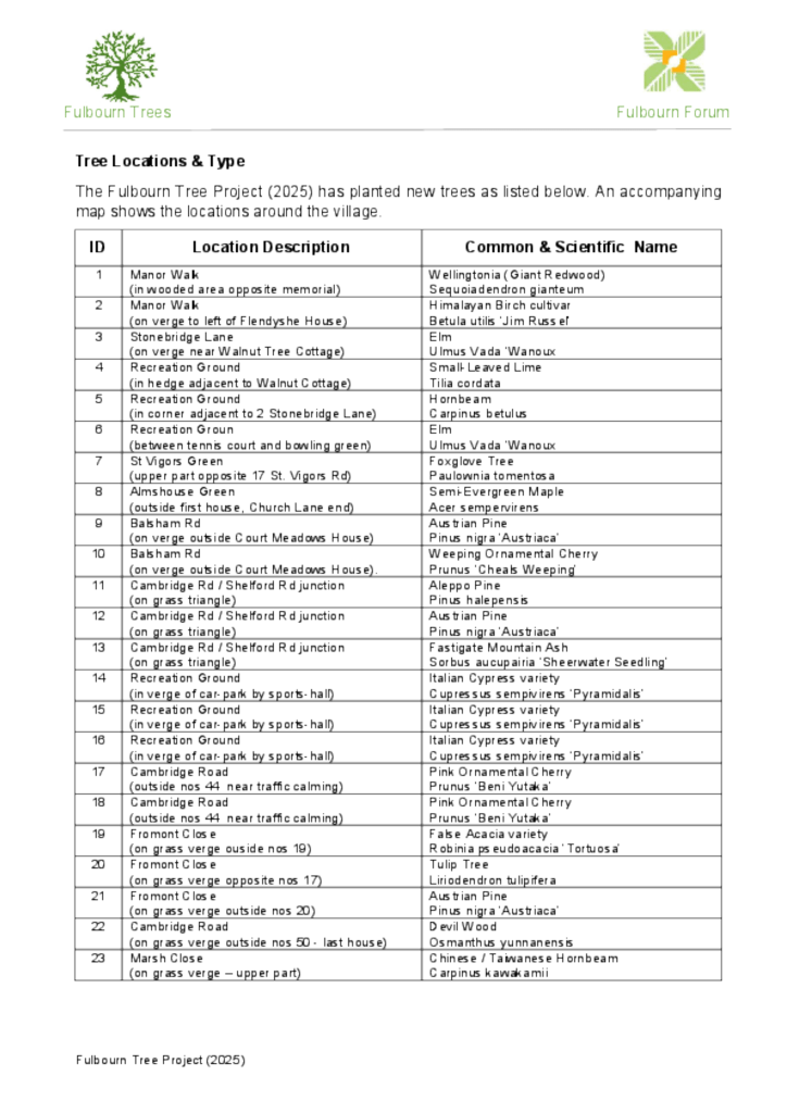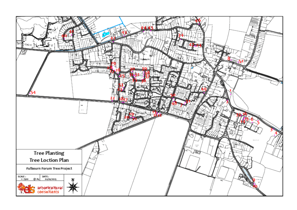 During 2024 an extensive survey was carried out of the village trees on public land to identify species, age and condition. This indicated that whilst Fulbourn benefits from many trees there is evidence of stress and a mature age profile. These findings were used to create the planting programme that is currently being implemented.
